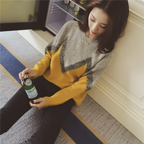圆领亮丝拼色长袖套头针织衫